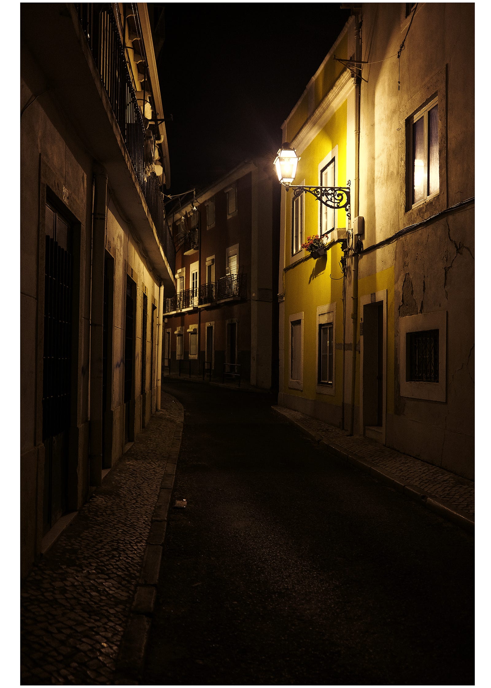 În imaginea de mai sus este prinsă o străduță din Lisabona, aflată literalmente la doi pași de cazarea noastră din Bairro Alto. Ne-am plimbat pe ea aproape în fiecare zi din cele 5 petrecute acolo, dar cel mai mult mi-a plăcut s-o traversez noaptea, în drum spre zona de bistrouri și cafenele fado. Cele câteva minute în care ne strecuram în liniște pe sub geamurile oamenilor, pe trotuarele pavate cu piatră cubică, aveau amprenta unui soi de ritual asimilator, din cauza solitudinii și ritmului anodin al pașilor care te duc/aduc la locul familiar numit - chiar și pentru scurt timp - acasă.